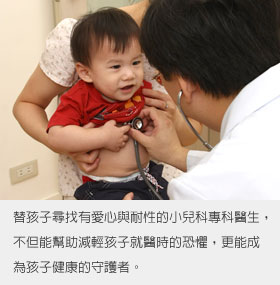 在面對醫生時,你可以先親切的與他交談,讓醫生了解孩子的病狀和心情,讓孩子感受你對醫生的信任,也讓孩子熟悉環境和人事。當孩子顯得害怕時,及時以肢體擁抱他,以溫柔的眼神和話語安慰他,盡量讓他安靜下來,當孩子表現不錯時,以言語讚美或實質獎勵,都能緩和就醫的不適感受。 在我的親身經驗裡,醫生的診療風格和態度,也會影響醫病的互動關係,為了營造和諧的就醫經驗,父母不妨事先打聽或透過親友推介,尋找有愛心與耐性的專業醫生。為了穩定情緒,讓孩子攜帶心愛的玩偶就醫,也能發揮陪伴和安撫的功效喔!